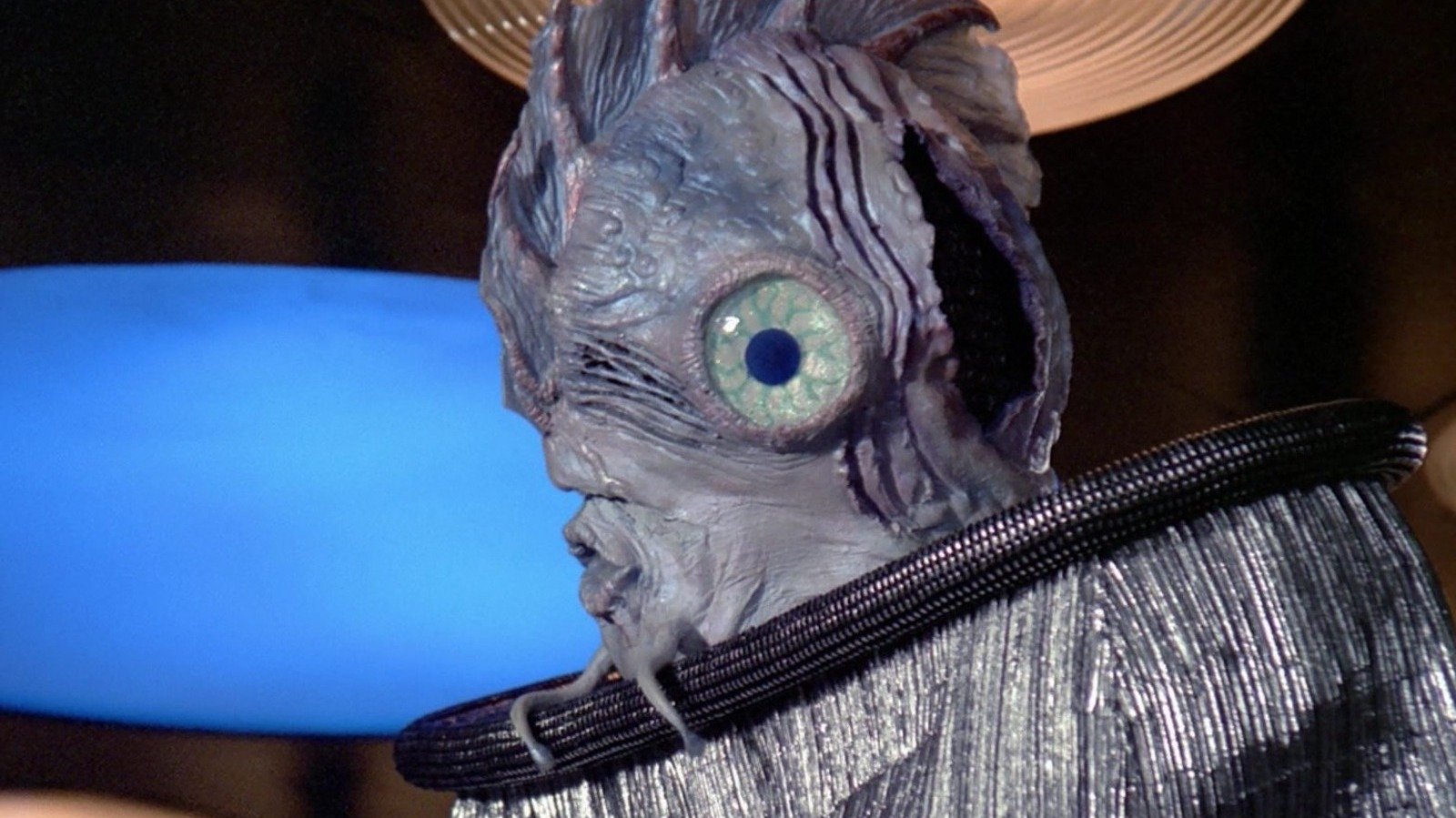 Indeed, in “Manhunt,” Lwaxana almost off-handedly stops an assassination attempt. A pair of Antedean ambassadors were also traveling on the Enterprise, and, just as they were preparing to beam to an ambassadorial summit, Lwaxana — a psychic — pointed out they were wearing explosives. The Antedeans are arrested and the day is saved, all in an instant. The Antedeans were an ichthyoid species with lavender skin and outsize fish-like eyeballs. They were seen earlier in the episode snarfing fish paste out of a drum and making strange trilling noises. Their lips are permanently fixed into an “oh” shape.