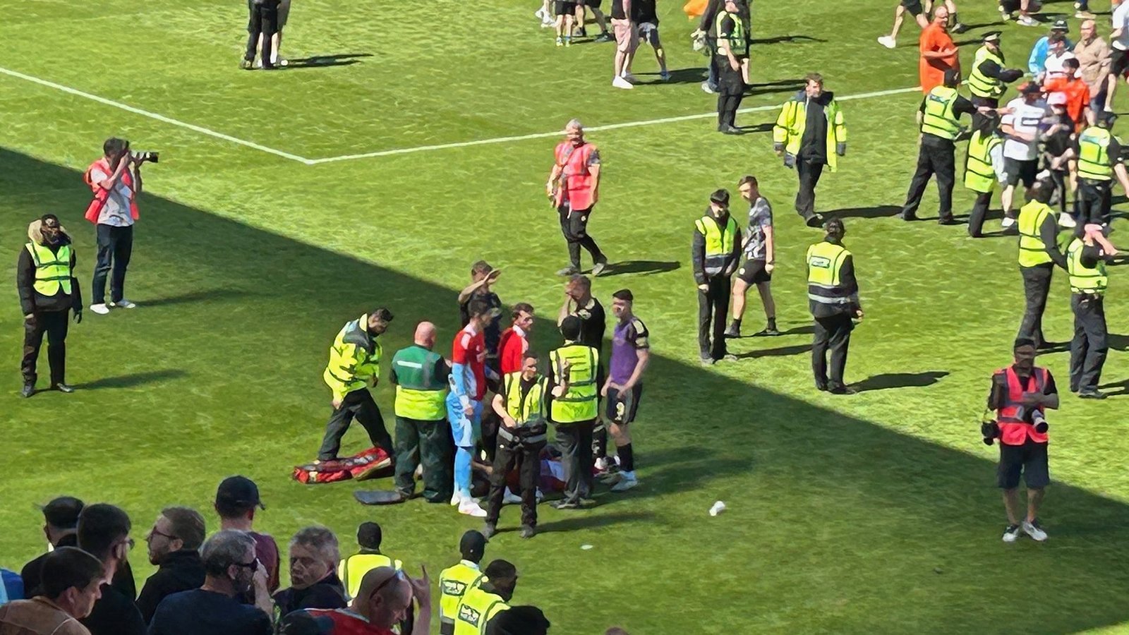 Aberdeen manager Mr Thelin said: “It is not acceptable, it is really, really bad. I haven’t seen exactly what happened, but our player got hurt, bad. I think everyone understands that is not OK.”Dundee boss Jim Goodwin also condemned the violence. Goodwin – who previously managed Aberdeen – said it was “an absolute disgrace.”He added: “For him to be hit and seriously damaged by an object thrown by his own supporters, it’s crazy.”More from Sky News:Crystal Palace pull off historic FA Cup winWomen’s World Cup to be expanded