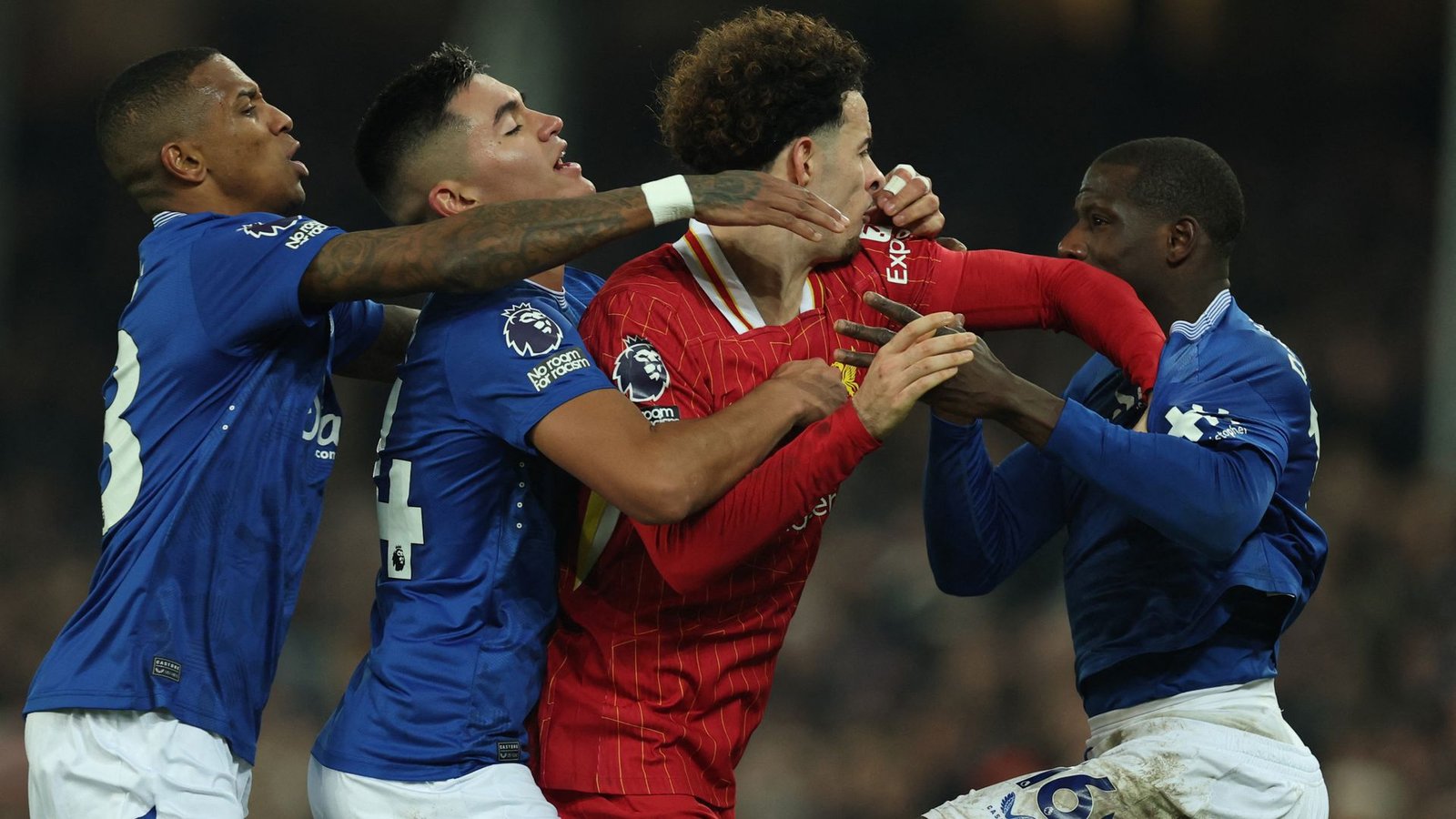 As fans spilled onto the pitch, Liverpool’s Curtis Jones and Everton’s Abdoulaye Doucoure scuffled in front of the visiting supporters. They were given second yellow cards and sent off.