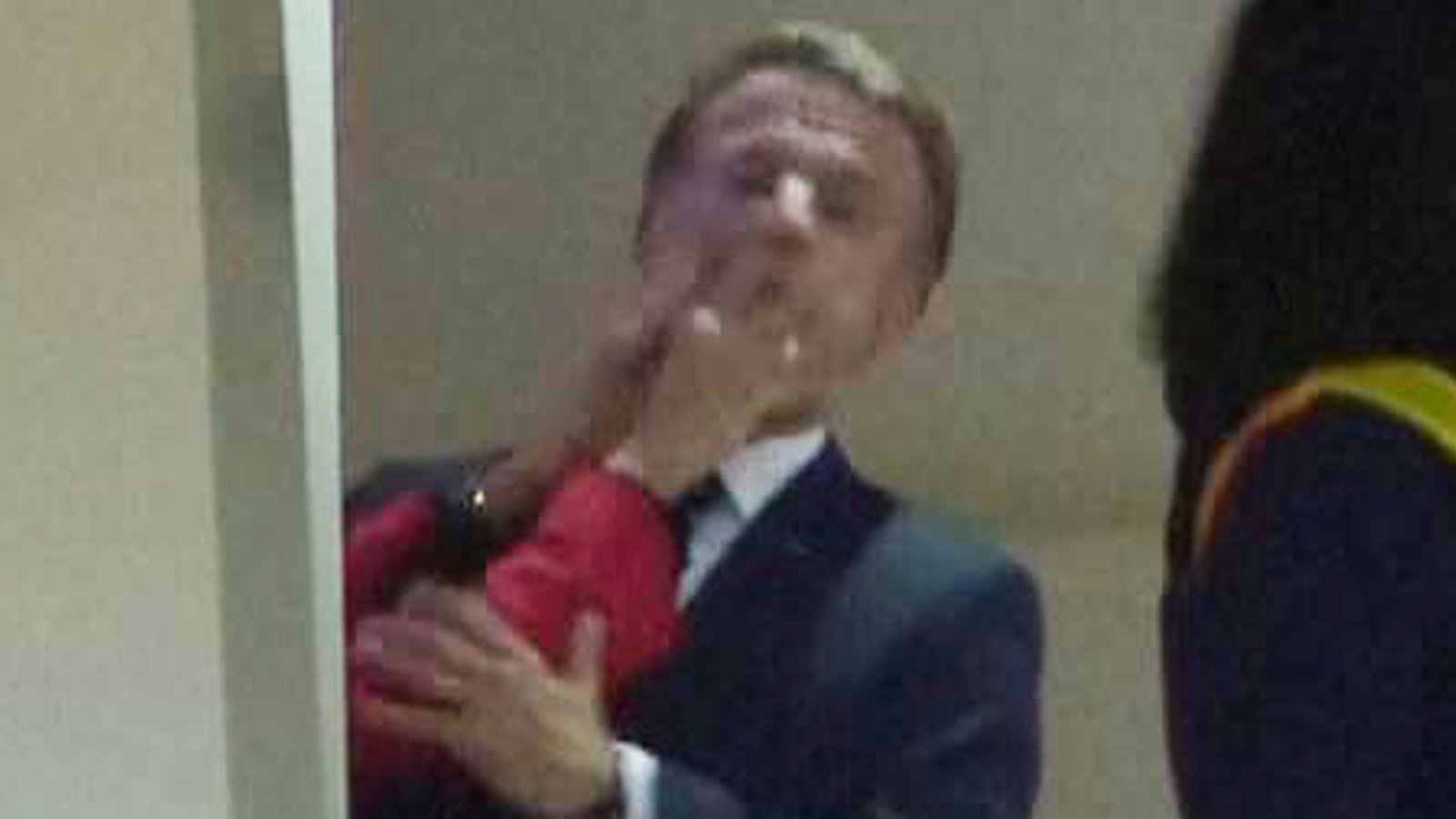 President Macron is seen taking a step back before he recovers and waves to the cameras at the bottom of the aircraft stairs.The pair then walk down the steps together.The Elysee initially denied the authenticity of images of the interaction before eventually verifying they were real, French media reported.